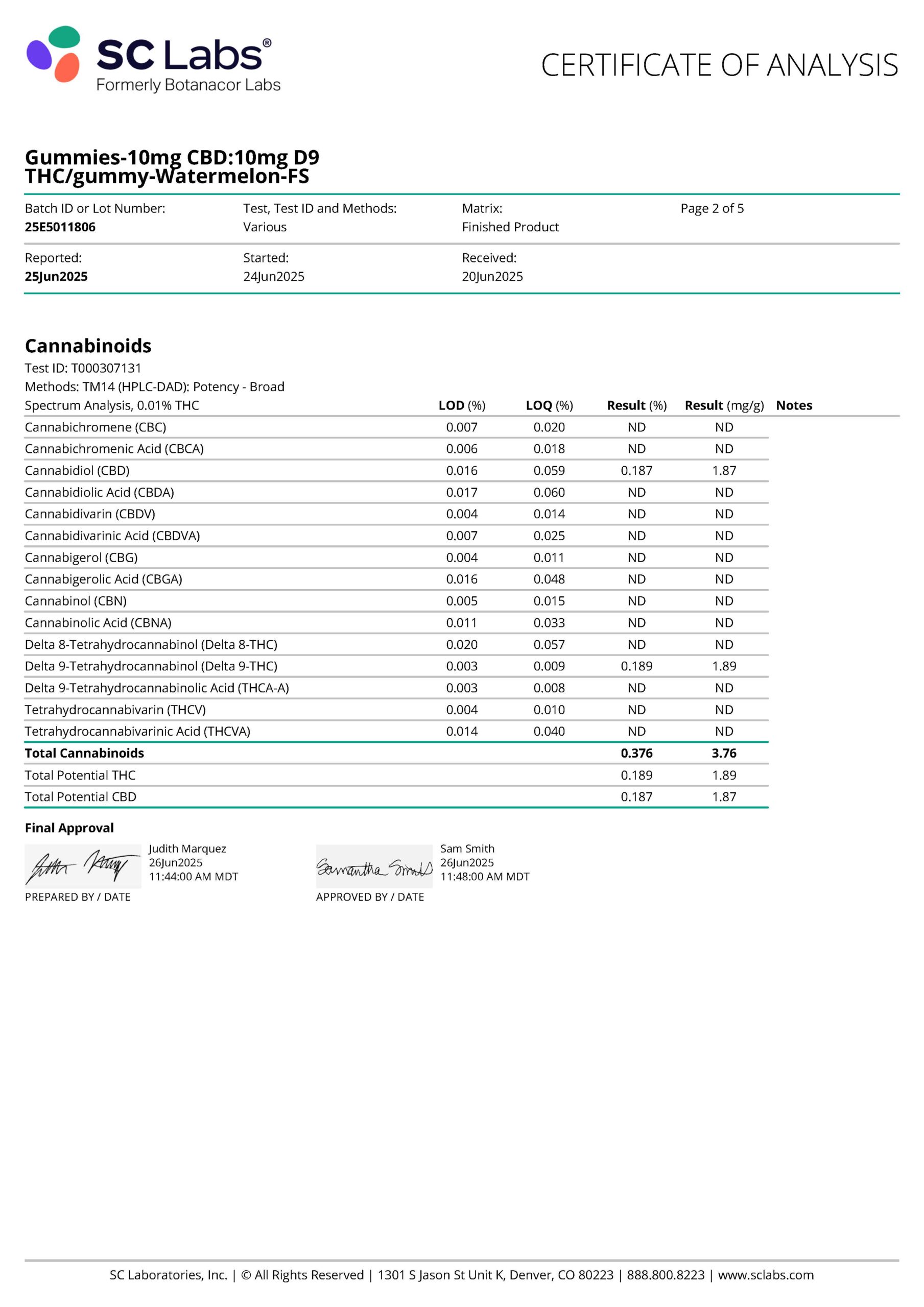 These delectable Watermelon Delta 9 THC sugar-coated gummies are fun to take, taste great and travel well. Each container contains 50mg D9 THC and 50mg CBD. With 5 vegan gummies per container, these are precisely dosed with 10mg of D9 THC and 10mg CBD each. They are gluten free and are lab-tested for purity. WARNING: Do not drive, operate machinery, or consume alcohol when taking this product.